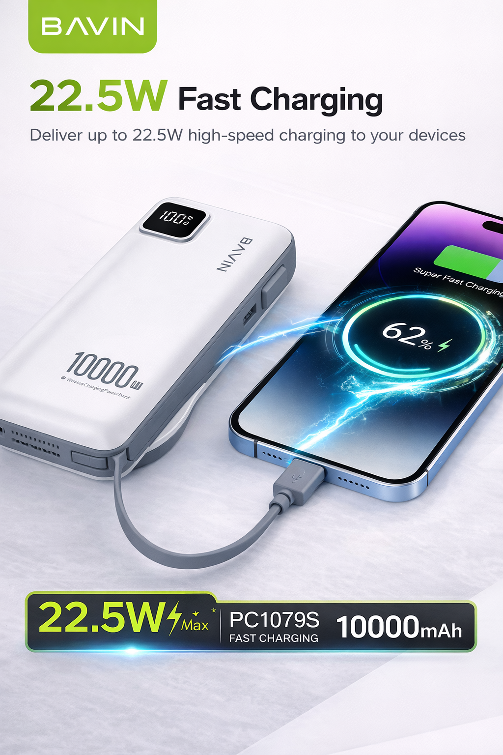 The BAVIN PC1078S Wireless Power Bank is a powerful 3-in-1 charging solution designed for modern smartphones. With a reliable 10,000mAh Li-Polymer battery, ultra-slim portable design, and 22.5W fast charging output, youβll never worry about running out of battery again β whether you’re at work, traveling, or outdoors.
