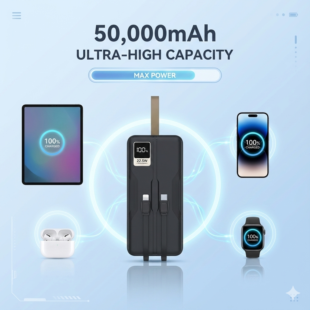 A convenient and reliable power solution for your life on-the-go, with a substantial 50,000mAh of charging power and 4 output ports for almost any device-charging need.