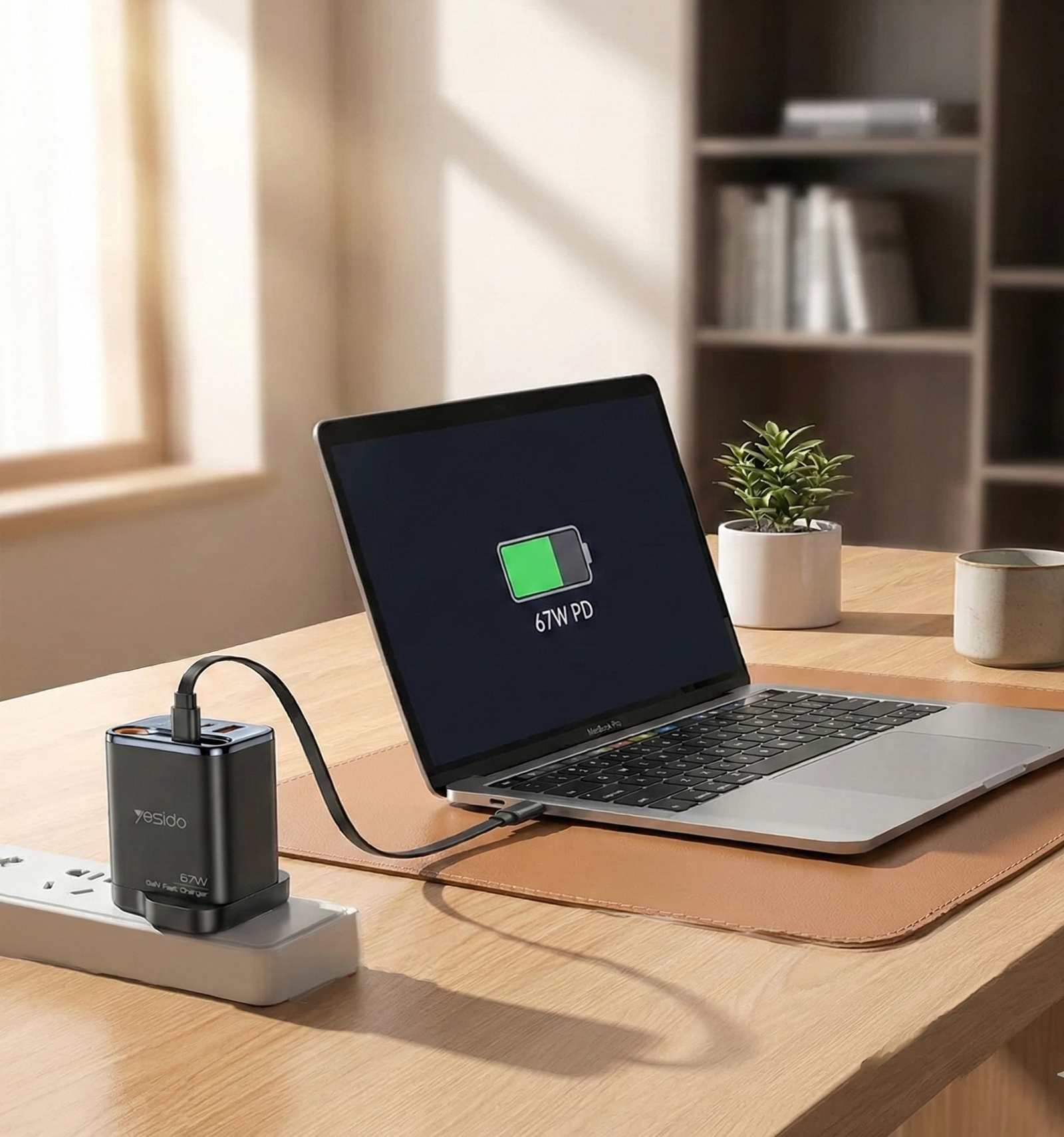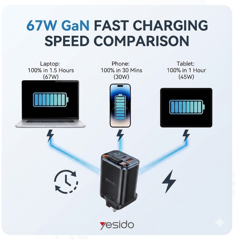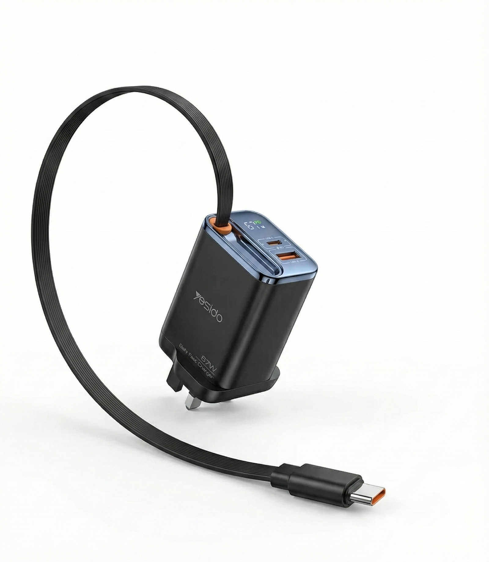 Yesido GaN 67W 3-Port Laptop & Phone Fast Charger with Retractable Cable (UK Plug)