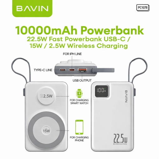 The BAVIN PC1078S Wireless Power Bank is a powerful 2-in-1 charging solution designed for modern smartphones. With a reliable 10,000mAh Li-Polymer battery, ultra-slim portable design, and 22.5W fast charging output, you’ll never worry about running out of battery again — whether you’re at work, traveling, or outdoors.