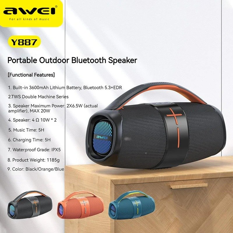 Experience powerful sound anywhere you go with the Awei Y887 Portable Bluetooth Speaker. Designed for outdoor adventures, home entertainment, and casual listening, this speaker combines deep balanced bass, long battery life, and colorful LED breathing lights to create an immersive audio experience.
