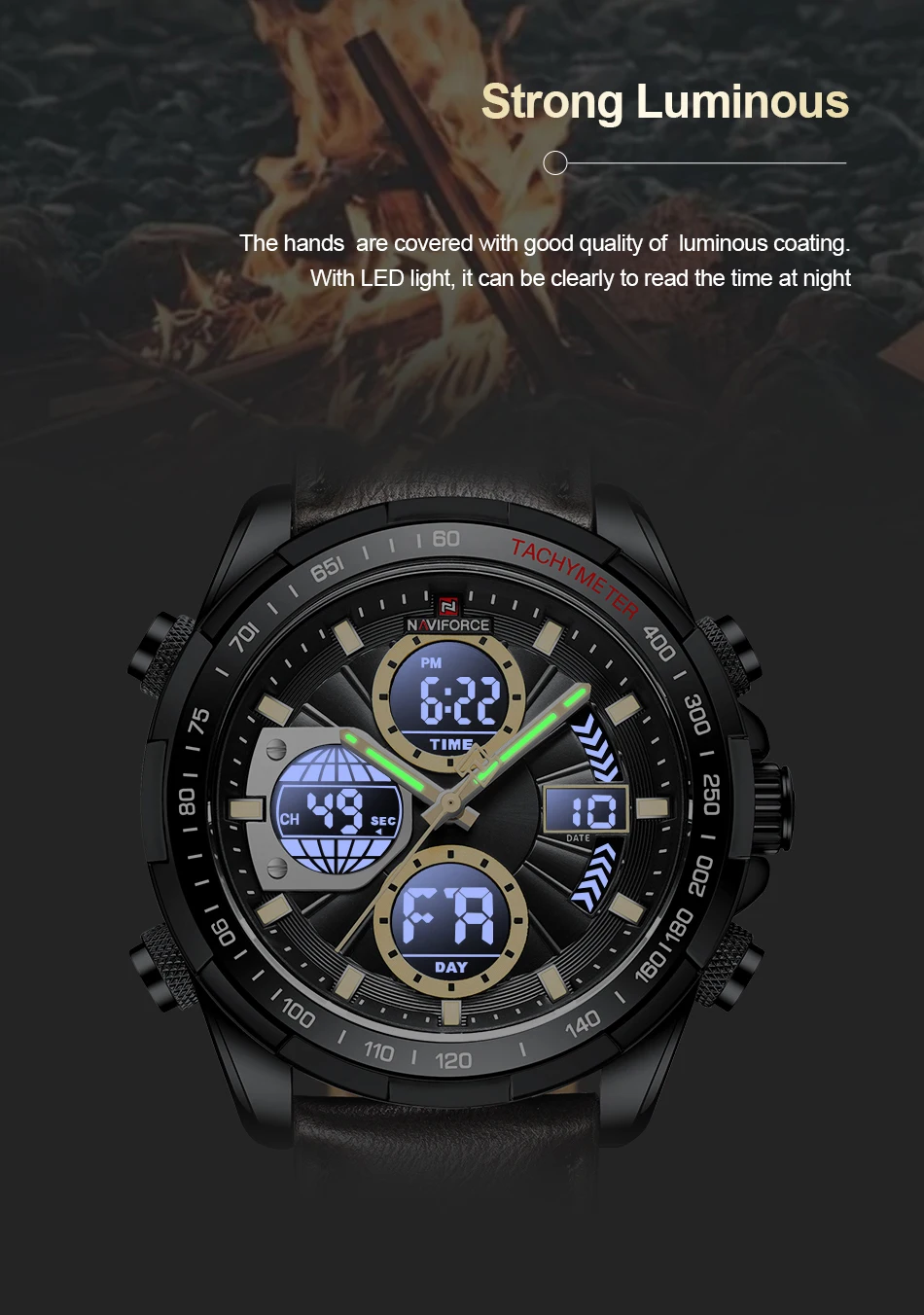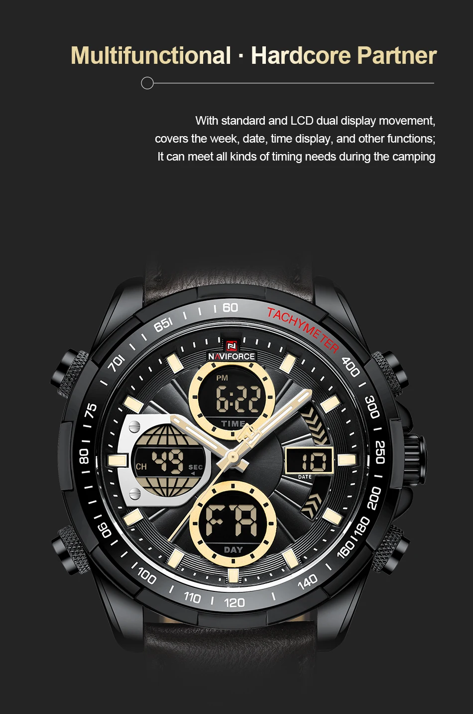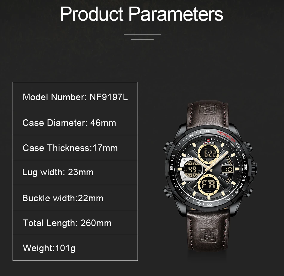 Feature: 30M Water Resistant, Luminous hands, Day and Date Display,Dual Time
